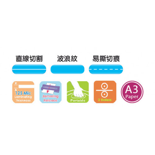 切紙器規格: 每次最多可切3 張紙(80 gsm),並有3 種切紙方式供選擇: 直線、波浪紋及易撕切痕