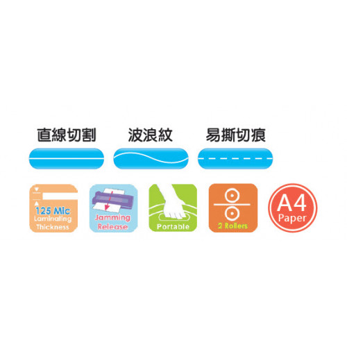 切紙器規格: 每次最多可切3 張紙(80gsm),並有3種切紙方式供選擇: 直線、波浪紋及易撕切痕