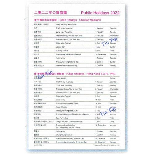 ● 用100克高級書紙,印1C+1C,內有中、港假期等其它資料
