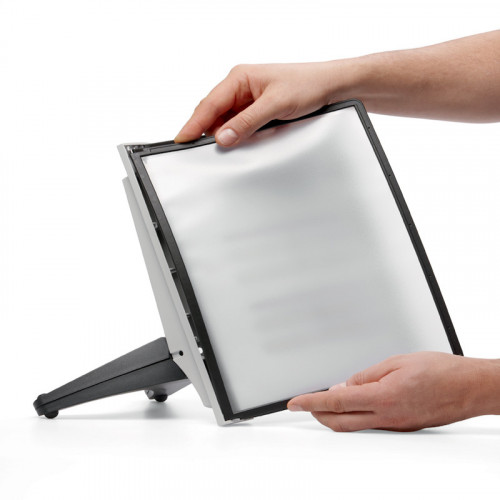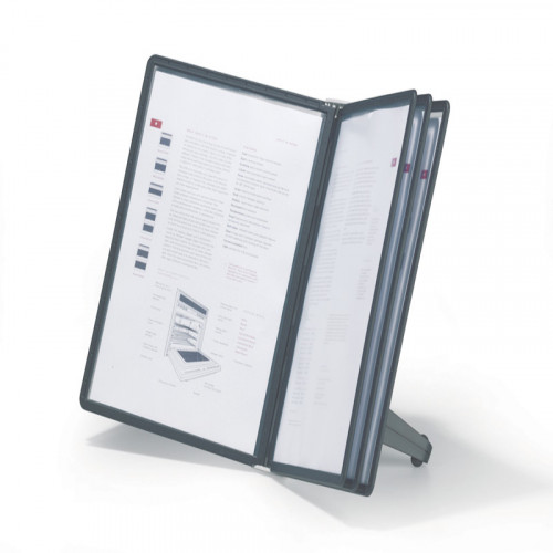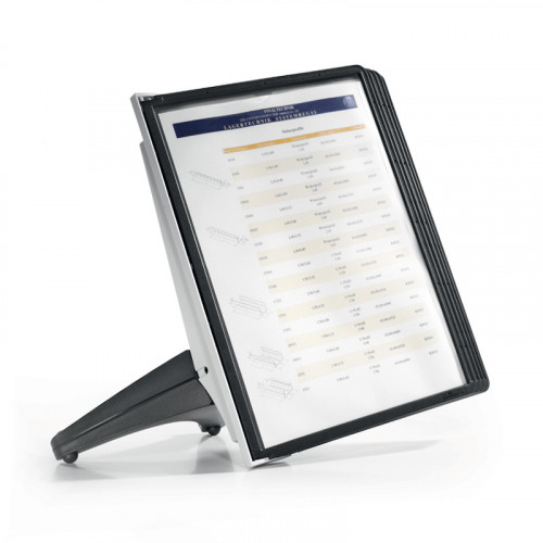 Easy to construct desk system with 5 A4 display panels for 10 A4 sheets of paper. The small, space saving unit is ideal for use when space is at a premium. The PP display panels are anti-glare and copy-proof, and are easily inserted into the unit.